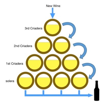 The Solara system is made up of a series of butts (refering to barrels not bottoms!) which are filled and blended as the sherry ages (these are also known as Criaderas in Spanish). As wine is taken out of the bottom of the solera system, to bottle the sherry before selling it, with more wine being added by moving the sherry from one level of criadera into another, blending it with some of the wine already in that part of the system. This results in a non-vintage product, as younger wines are blended with older wines right the way through the aging process, up until bottling.